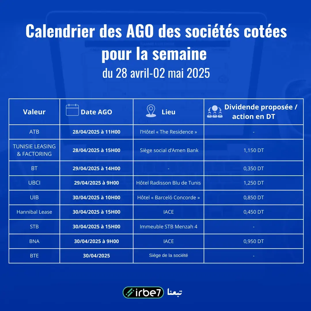 La semaine du 28 avril au 2 mai 2025 s'annonce particulièrement active pour les investisseurs dans le secteur bancaire et le leasing, avec plusieurs Assemblées Générales Ordinaires (AGO) programmées exclusivement pour des banques et des sociétés de leasing. Après une semaine précédente qui a vu 11 AGO des sociétés cotées de divers secteurs, cette semaine se concentre uniquement sur le domaine financier. Ces réunions cruciales permettront aux actionnaires de se prononcer notamment sur l'approbation des comptes et la distribution des dividendes dans ce secteur clé de l'économie tunisienne.